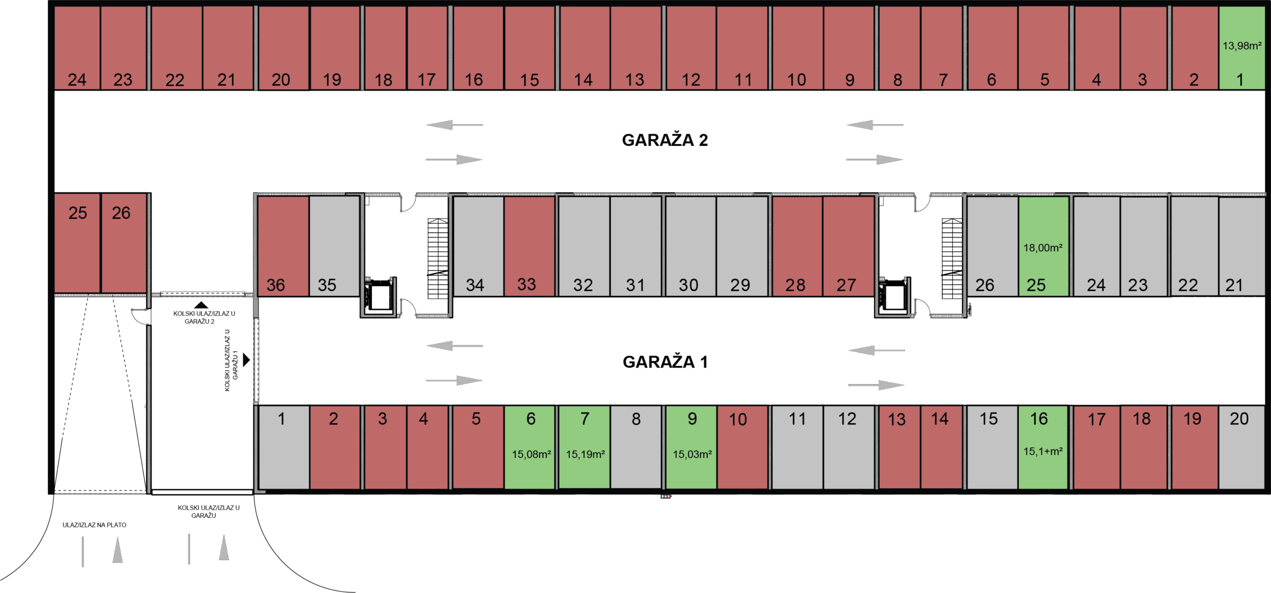 Zajednička garaža se nalazi na suterenskoj etaži objekta, a sastoji se od dva dijela GARAŽE 1 i GARAŽE 2. Kontrola pristupa je putem zajedničkih sekcionih garažnih vrata na daljinski.